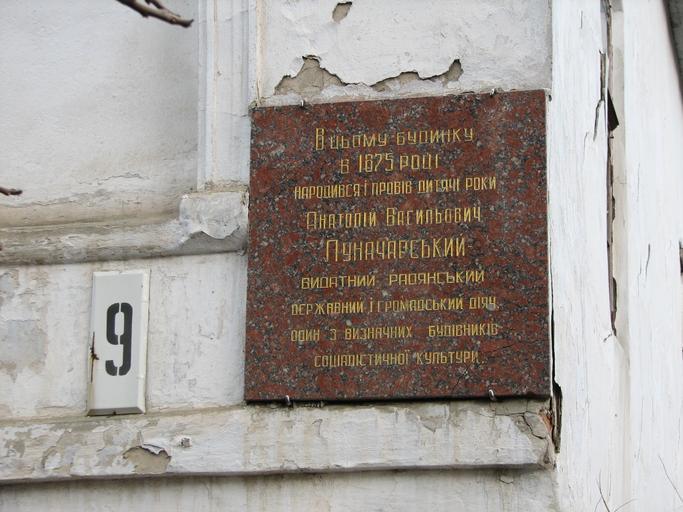 Keywords: Lunacharskij.JPG uk В цьому будинку в 1875 на одився і п овів дитячі оки А В Лунача ський own Tuma26 Commemorative plaques in Poltava 9 Pershotravnevy Lane Poltava