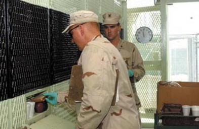 Keywords: Lunchtime at Camp 1, Guantanamo.jpg en Troopers of the Naval Provisional Guard hand out lunch to detainees inside of Camp 1 http //www jtfgtmo southcom mil/wire/wire/WirePDF/v6/TheWire-v6-i019-12AUGUST2005 pdf Jeshua Nace 2005-08 PD-USGov Camp 1 Guantanamo