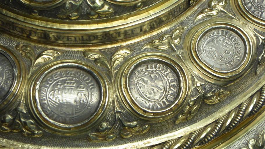 | Keywords: Lüneburger Münzpokal - Deckel - Silbermünzen 2.jpg de Lüneburger Münzpokal Deckel erste nicht vergoldete punzierte Wölbung der vergoldete runde Rahmen aufliegen mit 16 in diese eingelassenen silbernen Münzen im Bild drei davon sichtbar Zwischen zwei Rahmen ist jeweils ein vergoldetes Paar Blätter verschiedener Pflanzen angebracht Rahmen und Münzen vollziehen die konvexe Wölbung des Deckels mit Sie wurden für ihre Einsetzung also gebogen Die Wölbung erreicht schließlich die Waagerechte und stößt an eine durch ein Profil verbundene Zarge Diese ist nicht vergoldet und trägt in Niello eine Inschrift in Majuskeln žDE WISE MAN SICHT HINDE N VND VOR WES VORGA N GE N ITZICH VND NOCH VOR DER DORAFBROCK DER MU N TE DEIT VNS LERE N WO SICK DER WERLDE SCHEFTE VORKERE N im Bild nur teilweise sichtbar Ende und Anfang der umlaufenden Inschrift trennt eine kleine vergoldete Blüte žLüneburger Markstück von 1506; Lüneburger Dreiling o J 15 Jh ; Rostocker Schilling o J ; Stralsunder Witten; Rostocker oder Greifswalder Witten Rezeß von 1411; Demminer Witten; Lübecker Witten mir Vierpaß im Kreuz 14 Jh ; Lüneburger Sechsling; Lüneburger Schilling Löwe im verzierten Kreuz; Hamburger Schilling um 1440; Lüneburger Doppelschilling 1530; Hamburger Doppelschilling ca 1520; Lübecker Doppelschilling ca 1506 Rückseite Wappen von Wismar Hamburg und Lüneburg Stefan Bursche Hrsg Das Lüneburger Ratssilber Berlin 1990 S 134 Anm 2 2016-05-20 14 52 16 own Marsupium other versions cc-zero Lüneburger Münzpokal |
