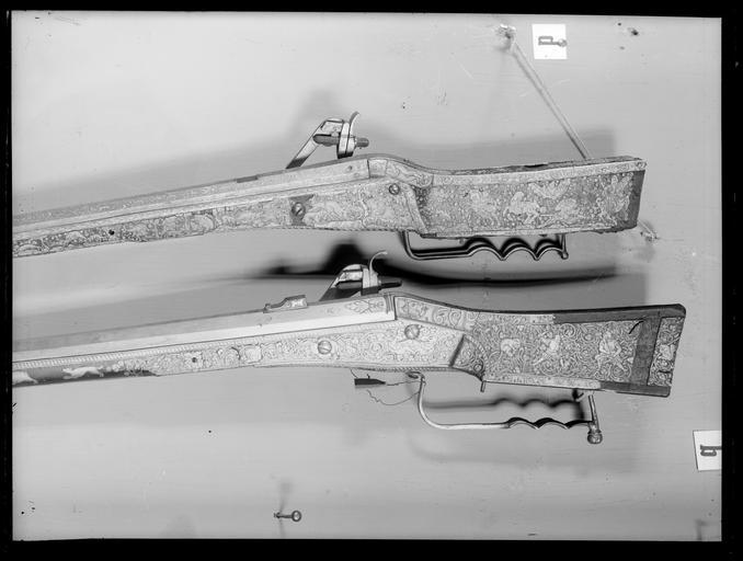 | Keywords: Luntlås-hjullåsbössa - Livrustkammaren - 68581.tif Rund slätborrad blånerad pipa med trumf och åttsidig kammare Rektangulärt böjt svansskruvblad Pipans ovansida täckt av nästan yttäckande påslagen dekor av guld och silver rankverk samt på pipans runda del två ovala kartuscher På kammarenssidofaser vid pipbasen stämplar i form av musselskal LRK vägl 1921 195 Därframför en stående naken kvinna med guldslöja över skötet i h hand ett timglas Tiden därovanför textband BEDENCK D S END På kammarens sidor i rankverket infogade framåt springande hundar rävar och harar av guld och silver Baktill på pipans runda del i den bakre kartuschen en stående kvinna med naken överkropp hellång guldkjol i h hand en guldvåg i v ett svärd med guldfäste Mittpå den runda delen i den främre kartuschen en stående kvinna huvudet profil h lång klänning av guld i h hand ett palmblad av guld i den v en otydlig figur stadsmodell 55 mm från mynningen en graverad björn på ryggen uppåtriktade svinbortsliknande hår sittande och spelande på en säckpipa av guld <br/>Riktmedel Mellan kartuscherna björnen och kornet påslaget en silversiktlist Inlaxade riktmedel siktet saknas korn av silver <br/>Fästning Tre häften Pipan fäst med krysskruv underifrån varbygelskruven samt tre nya pipstift av trä <br/><br/>Hjullås med plant blånerat bakåt i avsatser avsmalnande låsbleck av stål litet rundat ändutskott Hjul fäst med inåtlutande ring samt välvd hjulkapsel Fängpanna utan krutskärm lock med rörlig rektangulär arm Tryckknapp med svagt välvt huvud med skruvskåra Lång hane med kropp med fyrsidigt tvärsnitt innerkanten fasad nästan ringformig hanhals Överkäken lös kort svagt uppåtsvängt fingergrepp med ändvulst Hanskruv med fyrsidigt huvud Kraftig hanfjäder främre delen med rundade kanter bakre hälften med rankdekor ingen studel långt spetsigt åsat löv På låsblecket hjulkapseln och fängpannegaveln påslagen dekor av guld och silver rankverk och bakom hjulet två guldfåglar och en av silver framför hjulet ett bakåtseende rovdjur med kort svans och prickig päls leopard Nedanför säkringsfjädern samma stämpel som på pipan På fängpannelocket en graverad lejonmaskaron på armen ett serafhuvud med vingarna riktade bakåt På hanen graverad bladdekor på ringen på spetsen en maskaron <br/>Säkring Bakom hjulet virvelsäkring med ringformigt fingergrepp fjäder med streckdekor studel med droppformigt svagt välvt löv med mittstreck <br/>Fästning Två låsskruvar <br/>Avtryckare Rak avtryckare med liten ändkula i avtryckarblecket en ställskruv infälld i kolven <br/><br/>Helstock av valnöt med liten vinge kolvlåda och sluten laddstocksränna Nästan yttäckande dekor av vita och grönfärgade beninläggningar hjorthorn Bakplåten samt kantlisterna runt kolvänden saknas nästan helt Utefter stockens kanter lister med beslagsornamentik och flätmönster bakre delen av listen till h om kolvryggen ersatt Vid svansskruvbladets sidor två benplattor med nakna musicerande pojkar till v en lutspelare till h en med fiddla På kolvryggen bakom svansskruvbladet en platta med en mansbyst skäggigt ansikte därbakom ett rankverk och tre papegojor vindruvsklasar fruktfat samt en karyatid På kolvens h sida ovanför kolvlådelocket en figurscen med nakna människor Helenas bortrövande från h ryttare med spjut ersatt båt och två män som hjälper Helena stiga upp i båten stridsscen med 8 stående och en liggande man med klubbor och sköldar till h därom två bågskyttar en ryttare och ytterligare två bågskyttar Kolvlådelock med plan platta av hjorthorn därpå en stående kvinna huvudet profil v klänning och mantel i h hand ett brinnande hjärta i v en pil upptill text VENVS träplattan och fjädern utbytta Framför locket likaså en utbytt benplatta med bladdekor På anslaget en figurscen med Pauli omvändelse till v två ryttare med stegrande hästar en häst utan ryttare Paulus halvliggande på marken och ovanför honom ett moln och Guds bild längst till h ryttare Paulus och ryttarna i antikiserande rustningar Mellan låsskruvarna jaktscen med ryttare med spjut till v hjort som tvingats på knä av två hundar På framstockens sidor jakt- och djurbilder <br/>På v sida bakifrån ryttare med tvåklogaffel och vildsvin som står över en fallen jägare två hundar; jägare vänd mot kolvänden och björn angripen av två hundar; jägare som blåser i horn På den smalare delen därframför hjort och två hundar hund hjort två hundar hornblåsare hund hund och hornblåsare tre hundar två harar samt tre hundar och liggande byte <br/>På framstockens h sida bakifrån björn omgiven av två hundar och två jägare med björnspjut den främre jägaren mindre och placerad på framstockens smalare del; därframför hjort och bakåtvänd jägare med spjut; tre hundar; vildsvin och två bakåtvända jägare den bakre till häst; bakåtvänd hund och framåtvänd hornblåsande jägare; fyra hundar och därframför liggande byte omgivet av två hundar springande hare samt en liten mansfigur <br/>Näsband l 57 mm med bladdekor På h sida saknas de två bakre pipstiftbrickorna den främre ersatt med en nytillverkad kopia av den på v sida Överrörka och spetsrörka i form av benplattor med graverad dekor <br/>På stockens undersida bildfält med de nio muserna på framstocken och sju planeter på kolven På överrörkan en kvinna profil h i v hand ett tvåuddigt föremål Ovanför kvinnan en flammande sol och textband NOVIM MVSE VRANIA den himmelska attribut vanligen en himmelsglob På nederdelen av plattan text till följande bild ERATO den älskliga attribut lyra Fält 2 kvinna helfigur profil v huvudet profil h i händerna en kula glob för Urania överkroppen till knäna och benens nederdel hör ej samman Fält 3 kvinna helbild fas huvudet profil h i h hand en skriftrulle i v bok upptill text CALIOPE den skönstämmiga attribut skrifttavlor o