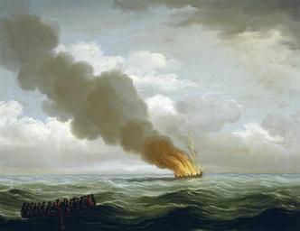 Keywords: Luxborough galley burnt nearly to the water, 25 June 1727.jpg The 'Luxborough Galley' burnt nearly to the water 25 June 1727 ca 1727 oil canvas cm 49 5 64 8 National Maritime Museum object history credit line National Maritime Museum Greenwich London Greenwich Hospital Collection The ˜Luxborough ™ galley is show burning fiercely as the crew look on from the yawl or ship ™s boat in which they have made their escape The sixteen men who were left on board the galley perished in the burning wreck The ˜Luxborough ™ galley captained by William Kellaway carried slaves for the South Sea Company She was lost between the Caribbean and England on the third part of the infamous Triangular Trade She left England in October 1725 for Cabinda in West Africa on the first leg of the triangular route Here the captain exchanged his cargo of Indian cottons and trade goods for 600 slaves During the second leg of the triangle between Africa and the Caribbean eight crew and 203 Africans died of smallpox before arriving in Jamaica in October 1726 After selling the surviving slaves the ˜Luxborough ™ galley left Jamaica in May 1727 for England loaded with rum and sugar On 25 June 1727 she was accidentally set on fire when a keg of rum in the spirit room burst and the ship caught fire and sank Kelloway and his crew were then set adrift in the mid-Atlantic After a fortnight the yawl arrived on the coast of Newfoundland 7 July 1727 and was rescued by fishermen The loss of the ˜Luxborough ™ Galley by fire was notorious because the survivors in the ship's boat had to resort to cannibalism to stay alive This is one of a set of six scenes ˜The Loss of the Luxborough Galley in 1727 and the Escape of Some of her Crew ™ Signed and dated ˜I C 1760 ™ <ref>http //collections rmg co uk/collections/objects/13864 html Royal Museum Greenwich</ref> reflist accession number BHC2388 http //www nmmprints com/image php imgref BHC2388 National Maritime Museum PD-art-100 John Cleveley the Elder Paintings in the National Maritime Museum London Burning ships Luxborough Galley Burning ships in art 1727 paintings