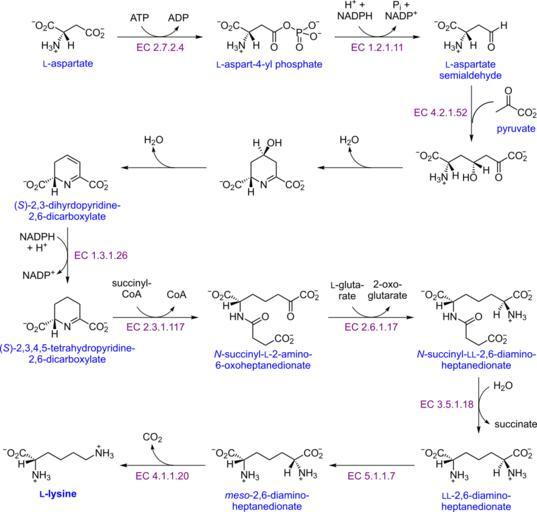 Keywords: Lysine Biosynthesis.svg Biosynthesis of lysine Selfmade with ChemDraw 2007-02 Calvero PD Biosyntheses Amino acid metabolism Lysine