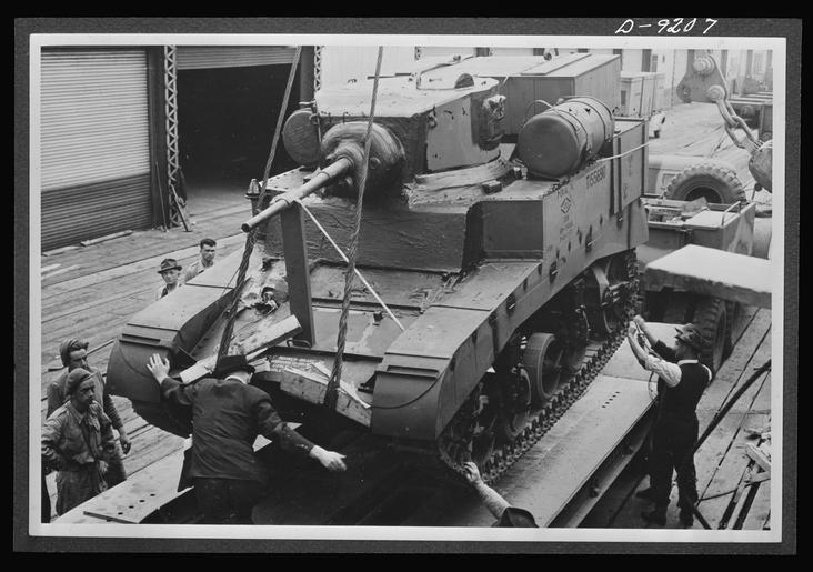 | Keywords: M3-Stuart-Australia-1 8b08136u.tif An American M3A1 Stuart light tank provided by Lend-Lease is unloaded onto a tank transporter at the Australian port of Melbourne Victoria on 20 February 1943 for use by an Australian armoured division <br/> <br/> Original U S caption American lend-lease equipment is playing a vital part in the development of United Nations mechanized forces Here an American light tank to be used for training Australia's armored crews is unloaded at an Australian port <br/> Original Australian caption MELBOURNE VIC 1943-02-20 ARRIVAL IN AUSTRALIA OF LEASE-LEND MATERIALS FROM AMERICA PERSONNEL OF AN AUSTRALIAN ARMOURED DIVISION EXCITEDLY AWAIT THE SETTLING IN TO POSITION OF A GENERAL STUART M3A1 LIGHT TANK ON TO THE SPECIAL TANK TRANSPORTER PRIOR TO DRIVING IT AWAY FOR IMMEDIATE OVERHAUL Author 1943-02-20 Library of Congress Prints Photographs Division Farm Security Administration - Office of War Information Photograph Collection Reproduction number http //hdl loc gov/loc pnp/fsa 8b08136 LC-USE6-D-009207 and date from http //www awm gov au/collection/029385/ PD-Australia File M3-Stuart-Australia-1 jpg cropped from 16-bit TIFF original M3A1 Stuart |