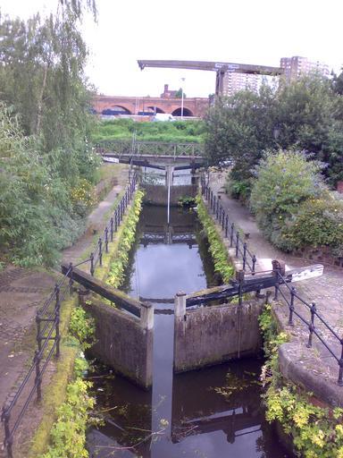 | Keywords: M&SJC looking north.jpg Manchester and Salford junction canal entrance looking north towards the Irwell Own 2007-07-16 Parrot of Doom Canal locks on the Manchester and Salford Junction Canal Derelict canal locks in England River Irwell Railway bridges in the City of Salford |