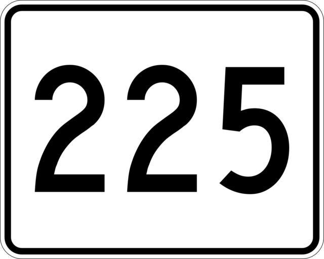 Keywords: MA Route 225.svg 750 mm by 600 mm 30 in by 24 in Massachusetts Route shield made to the specifications of the http //166 90 180 162/mhd/downloads/manuals/1996Mconst pdf 1996 edition of Construction and Traffic Standard Details sign M1-5 Uses the http //www triskele com/fonts/index html Roadgeek 2005 fonts United States law does not permit the copyrighting of typeface designs and the fonts are meant to be copies of a U S Government-produced work anyway The outside border has a width of 1 1 mm and a color of black so it shows up; in reality signs have no outside border The specs actually do not show the curve on the outside border instead making it a perfect rectangle but all signs I have seen round the corners Note The specs specify Series D font for the numbers However that font does not fit when none of the characters is a one and so those signs actually use Series C This image is true to real signs not the specs own SPUI spuiother Diagrams of Massachusetts Route shields Massachusetts Route 225 |