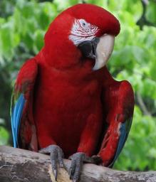 Keywords: macaw parrot bird colorful feather perched tropical red blue white wings portrait looking beak close up