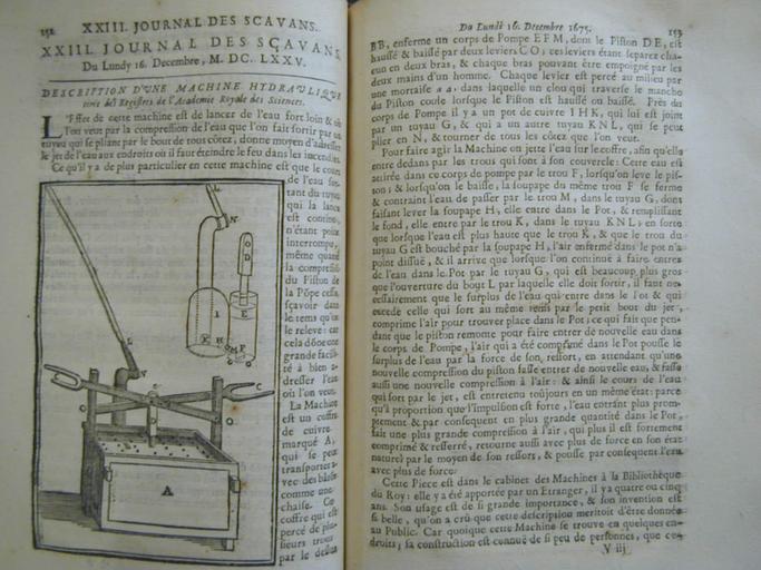 | Keywords: Machine à incendie.JPG fr Cette machine à incendie est d'origine inconnue puisque l'article dit qu'elle fut apportée il y a 4 ou 5 ans par un étranger Elle démontre cependant une grande maitrise de la pneumatique et de hydraulique en 1671 et cette date coincide avec l'entrée de Denis Papin à l'académie des sciences de Paris à l'age de 24 ans Son fonctionnement l'eau est jetée avec des seaux sur la surface de la boite et tombe par les trous au fond Avec les deux manches on actionne la pompe qui en tirant envoie l'eau dans un premier réservoir En poussant la pompe cette eau ne peut ressortir grace à un clapet anti retour l'eau est donc envoyée dans un second réservoir qui se remplit peu à peu et entre en pression car de l'air y est emprisonné l'élasticité de l'air dans ce second réservoir maintenue par le pompage permet d'obtenir un jet continu et de diriger ce jet vers les points de feu à eteindre en Rough translation This fire pump is of unknown origin as the article says she was brought there are 4 or 5 years by a stranger However it shows a great mastery of the air and water in 1671 and this date coincides with the entry of Denis Papin at the Academy of Sciences in Paris at the age of 24 years Operation Water is thrown with buckets on the surface of the box and falls through the holes in the bottom With the two sleeves the pump is actuated by pulling sends water into a first tank Pushing the pump the water can not out thanks to a check valve the water is sent to a second tank which fills gradually and between pressure because air is trapped the elasticity of the air in the second tank maintained by the pump provides a continuous stream and direct the jet to extinguish fire points journal des savants 1675 inconnu attribué à Denis Papin 1670-1671 PD-old-100 Denis Papin 1675 Historical fire engines of France Journal des sçavans |