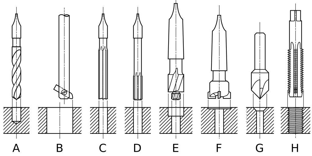 | Keywords: Machined Holes.svg en A diagram showing various tool used to machine holes in metal and the form of the hole produced See the key below own Inductiveload 06/11/2008 Key to Labels wikitable English - A Twist Drill - B Boring Bar - C Hand Reamer - D Machine Reamer - E Counterbore - F Spotfacer - G Countersink - H Tap Cutting tools SVG tools |