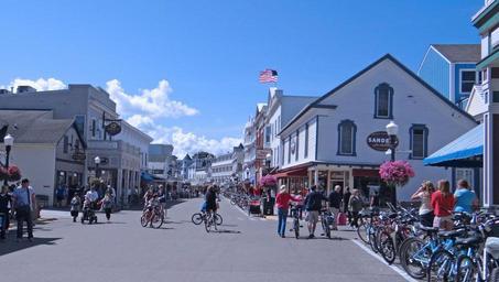 Keywords: mackinac island street visitors island sky blue clouds people tourists bicycles buildings michigan