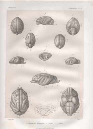 | Keywords: Madagascar Mammiferes Pl 87.jpg de historische Darstellung der Anatomie der Gehirne eines 1 Edwards-Sifaka Propithecus edwardsi 2 Wollmakis Avahi und 3 + 4 Indriartigen Indriidae im Vergleich Source Louveau 51 183 Propithecus edwardsi Propithecus anatomy Primate brain Mammal brain comparisons |