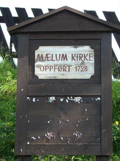 Keywords: Mælum kirke (opslagstavle).JPG Opslagstavle ved Mælum kirke Telemarken own 2013-07 Orfeus Mælum kirke