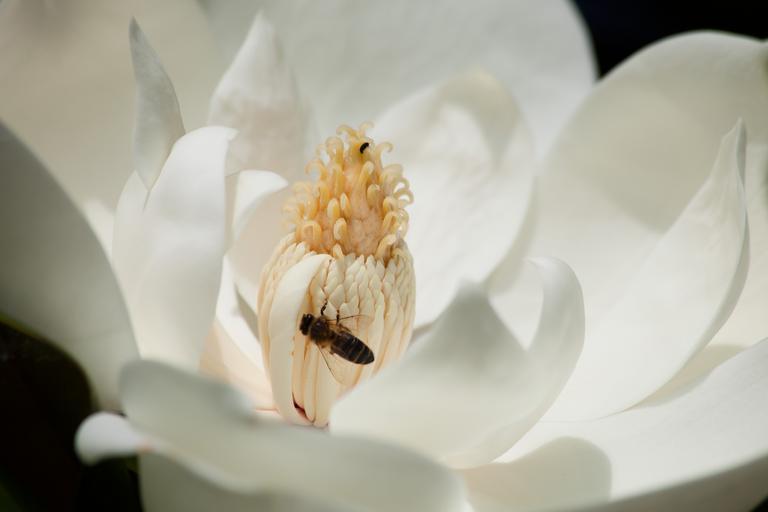 Keywords: magnolia blossom bloom white bee insect nature flower bloom plant close flora pollen garden nectar macro
