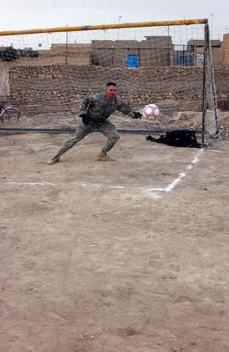 | Keywords: Maj. Masaracchia Reaches for a Soccer Ball DVIDS11961.jpg en Maj Charles Masaracchia the air operations officer for the 2nd Battalion 325th Airborne Infantry Regiment 82nd Airborne Division reaches for a soccer ball while playing soccer with some members of the Iraqi Security Force in Tall Afar Iraq Nov 5 2005 U S Army photo by Pfc James Wilt 2005-11-05 Staff Sgt James Wilt https //www dvidshub net/image/11961 11961 2005-11-07 15 29 TAL AFAR IQ PD-USGov 82nd Airborne Division Images from DoD uploaded by Fæ Tal Afar |