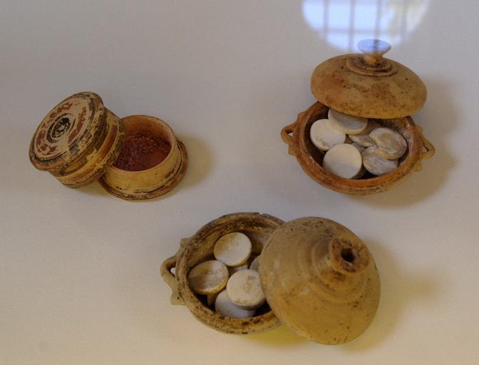 | Keywords: Make-up boxes KAM Athens 15598;15539;15537.jpg Corinthian pyxis with a red powder and two make-up pots with molded tablets of white lead all having the same diameter and weight 2 75 cm and 5 5 g Found in a tomb from the 5th c BC Pyxide corinthienne avec une poudre rougeâtre et deux pots à fard contenant des pastilles moulées de blanc de céruse de diamètre et de poids identiques 2 75 cm et 5 5 g Trouvés dans une tombe du Ve s av J -C Museum Kerameikos Archaeological Museum object history credit line accession number Inv 15598 15539 15537 User Bibi Saint-Pol own 2009-08-16 Photographie prise à l'exposition « Le Bain et le Miroir » du Musée de Cluny other versions <gallery> File KAMA Boîtes à maquillage jpg Alternative view File Make-up box KAM Athens 15539 jpg Detail File Make-up pyxis KAM Athens 15598 jpg Detail </gallery> Ancient Greek cosmetics Ancient Greek pottery pyxides Ancient Greek pottery in the Kerameikos Archaeological Museum Athens Le Bain et le Miroir exhibition 5th-century BC pottery in Athens |