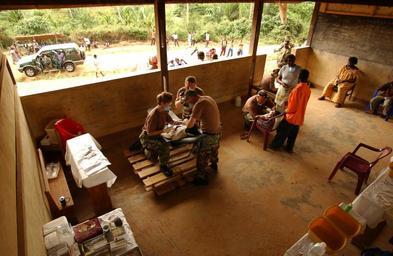 | Keywords: Makeshift examining room in Ghana.jpg 030910-N-6967M-081 In most Ghana villages the Navy set up clinics in the local school usually the only place with electricity All Hands February 2004 pg 25 Photo by Photographer's Mate 1st Class AW Shane McCoy RELEASED http //www navy mil/view_ahhphotos asp page 34 Shane T McCoy 2003-09-13 PD-USGov-Military-Navy Photographs by Shane T McCoy United States Navy in Ghana 2003 Military field hospitals in Ghana | ||||
