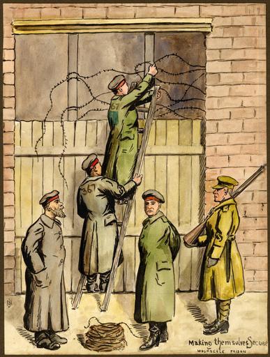 Keywords: university of victoria universityofvictoria uvic great britain. army. royal regiment of artillery greatbritainarmyroyalregimentofartillery caricatures and cartoons--20th century caricaturesandcartoons20thcentury notebooks war artists warartists world war, 1914-1918--pictorial works worldwar19141918pictorialworks world war, 1914-1918--caricatures and cartoons worldwar19141918caricaturesandcartoons drawing people vehicle bike surreal photo border Item is one of 123 pen-and-ink drawings and watercolours from two volumes titled: "Sketches of the War: France/Belgium". The sketches vary from satirical cartoons to more detailed and naturalistic renditions. They are often accompanied by an ironic title and are often signed with the artist's initials, "J.M." The artist's satirical targets include the officers and high command of both combatant sides; the disjuncture between reported and actual events, and the death of civilians as a fact of modern warfare. Item is one of 123 pen-and-ink drawings and watercolours from two volumes titled: "Sketches of the War: France/Belgium". The sketches vary from satirical cartoons to more detailed and naturalistic renditions. They are often accompanied by an ironic title and are often signed with the artist's initials, "J.M." The artist's satirical targets include the officers and high command of both combatant sides; the disjuncture between reported and actual events, and the death of civilians as a fact of modern warfare. |