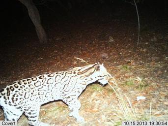 | Keywords: [Jaguar 2013 10-15.jpg] Male ocelot photographed by automatic wildlife cameras in the Huachuca Mountains on October 15, 2013, as part of a U.S. Fish and Wildlife Service/Department of Homeland Security-funded jaguar survey conducted by University of Arizona. This ocelot, one of two currently known in the Huachuca Mountains, was last photographed by a UA trailcam on February 5, 2013. The last detection of the other ocelot in the Huachuca Mountains by a UA trail cam was May 22, 2013. Photo Courtesy of UA/USFWS [Jaguar 2013 10-15.jpg] Male ocelot photographed by automatic wildlife cameras in the Huachuca Mountains on October 15, 2013, as part of a U.S. Fish and Wildlife Service/Department of Homeland Security-funded jaguar survey conducted by University of Arizona. This ocelot, one of two currently known in the Huachuca Mountains, was last photographed by a UA trailcam on February 5, 2013. The last detection of the other ocelot in the Huachuca Mountains by a UA trail cam was May 22, 2013. Photo Courtesy of UA/USFWS |