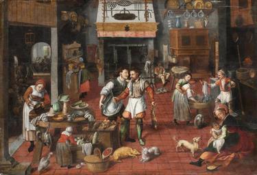 | Keywords: Måleri, genrebild. Köksinteriör - Skoklosters slott - 88962.tif  Män kvinnor och djur köksredskap I bakgrundens mitt öppen spis till höger skåp <br/>På baksidan målat 34 två gånger 4 cm högt Lapp på baksidan Ett Köks-stycke flere personer sysselsatte med åtskielliege göromål samt flere Stil-leben i ett annat rum bordsällskap målad på träd af R Londius 33 tum hög - 48 tum bred Lappens storlek 10 x 16 cm <br/><br/>Kitchen interior <br/>This painting shows an interior view of a larger kitchen with various figures occupied in different tasks At the center of the composition are two men the one on the right is about to cut up a rabbit while the other holds a plate possibly for assistance In the left corner of the foreground is a woman stirring a pot and to the left sits a woman nurcering a child Behind them is a smaller brawl as one man grabs a woman who is doing the dishes to the clear annoyment of her fellow dishwashing colleague In the background in the upper left corner sits a party of people eating by a table This painting shows a similarity to the characters in Cake Scene by van Cleve at the Museo di Castelvecchio in Verona original caption Måleri genrebild Köksinteriör <br/> Nyckelord Köksinredning Interiör Matlagning Djur Möbler Målning Golv Köksredskap ca 1565 oil on canvas size mm 1160 805 SKO Barn i ett gammalt slott - stormakt skatter spöken 1997 Skoklosters slott Dukning för Slottskollo tema mat och dukning 2009-2012 Skoklosters slott place of origin original filename sm_dig3533 24929 inventory number SKO 3635 88962 PD Jens Mohr Jens Mohr Paintings of kitchens 1565 People in kitchens in art 1565 Cooking in art Kitchen furniture 1565 1565 paintings Marten van Cleve 1565 Media contributed by LSH unmatched objKeyword Media contributed by LSH unmatched creator Media contributed by LSH unmatched keyword Media contributed by LSH 2013-10 |