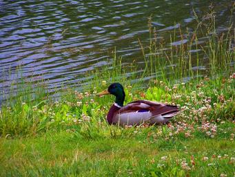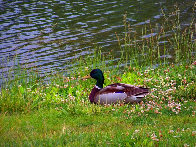 Keywords: mallard duck male bird single alone wildlife waterfowls water pond lake river grass plants background green brown feathers sitting isolated outdoors domestic