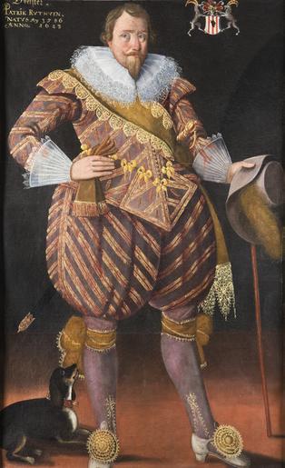 Keywords: Målning. Porträtt. Officersvän. Patrik Ruthven - Skoklosters slott - 87269.tif Patrick Ruthwen generalmajor plain text Helfigur stående fas höger vänster hand i sidan håller handskar i höger hand hatt och käpp Grå tröja med skört samt pluderhosen med guldgaloner gul axelbindel värja nedvikt pipkrage grå strumpor och skor Bredvid t v ligger hund <br/>Inskrift överst t v Oberster PATRIK RVTHVEN NATVS Ao 1586 ANNO 1623 <br/>Spikad på ram fastskruvad vid väggen <br/>Bakpå ramens vänstra list 8 ca 5 cm högt med krita original caption Målning Porträtt Officersvän Patrik Ruthven SKO 2258<br/> Nyckelord Herrmode Pösbyxor Barocken Man Ruthven Patrik Skotte Skorosor Hund Målning Porträtt Föremålsbild 1623 oil on canvas size mm 1195 1970 SKO Herman Wrangel riksråd fältmarskalk place of origin original filename sm_dig4908_2258 23516 inventory number SKO 2258 87269 PD Jens Mohr Jens Mohr Georg Günther Kräill 1623 portrait paintings Male 17th-century men of Sweden 1623 17th-century portrait paintings in Sweden 1623 17th-century portrait paintings of standing men at full length 1623 17th-century portrait paintings with dogs 1623 17th-century portraits with coat of arms Accessories for shoes Baroque paintings Canes in portrait paintings 1623 Lace collars in art 1623 Left hand on hip in portrait paintings 1623 Male clothing Male shoes in portrait paintings 1623 Portrait paintings of men holding hats 1623 Portrait paintings of men with dogs 1623 Portrait paintings of men with swords 1623 Media contributed by LSH unmatched creator Media contributed by LSH unmatched keyword Portrait paintings of men with dogs Blond beards in art Mammals in heraldry Media contributed by LSH 2013-10 |