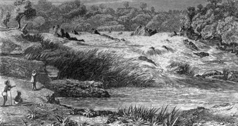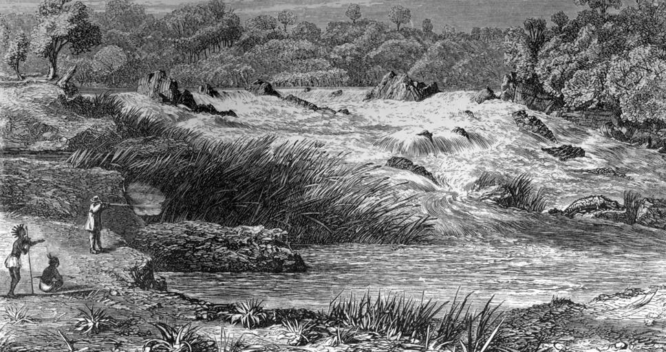 Keywords: Mamvira Cataract.jpg en Mamvira Cataract The First or Lowest of Murchison ™s Cataracts On the first ascent of the Shire our attention was chiefly directed to the river itself The delight of threading out the meanderings of upwards of 200 miles of a hitherto unexplored river must be felt to be appreciated All the lower part of the river was found to be at least two fathoms in depth It became shallower higher up where many departing and re-entering branches diminished the volume of water but the absence of sandbanks made it easy of navigation We had to exercise the greatest care lest anything we did should be misconstrued by the crowds who watched us After having made in a straight line one hundred miles although the windings of the river had fully doubled the distance we found further progress with the steamer arrested in 15E 55' south by magnificent cataracts which we called The Murchison after one whose name has already a world-wide fame and whose generous kindness we can never repay The native name of that figured in the woodcut is Mamvira It is that at which the progress of the steamer was first stopped The angle of descent is much smaller than that of the five cataracts above it; indeed so small as compared with them that after they were discovered this was not included in the number p 78 1865 http //libweb5 princeton edu/visual_materials/maps/websites/africa/livingstone/livingstone-images html David Livingstone Narrative of an Expedition to the Zambesi and Its Tributaries and of the Discovery of the Lakes Shirwa and Nyassa 1858-1864 London John Murray 1865 David Livingstone other versions PD-Art Uploaded with UploadWizard Cataracts waterfalls Shire River |