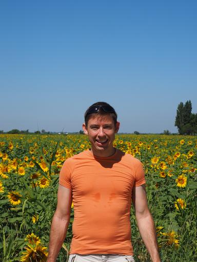 Keywords: man human person holiday sun joy happy rays summer day idyll male sweating warm heat sunflower sunflower field mas du pont de rousty camargue france