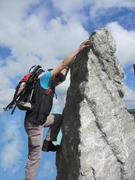 Keywords: man person climb mountaineer rock steep sky blue clouds