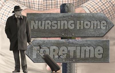 Keywords: man retirement home person directory direction arrow older old senior luggage bag go away piece of baggage clock time nursing home care for the elderly old people's home forward past