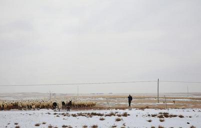 Keywords: man sheep shepherd flock winter snow cold alone landscape sky dog