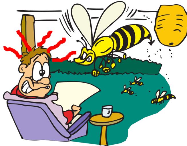Keywords: man wasps attack patio scare sting nest hive disturbed angry cartoon upset disturbing caricature irritated furious mad threatening fear intimidating scary dangerous