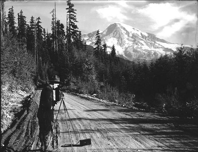 | Keywords: Man with camera and tripod photographing views in Mount Rainier National Park, Washington, ca 1907 (BAR 191).jpeg check categories 26 September 2015 2 Photograph Creator Albert Henry Barnes Made for an Eastman Co advertisement On sleeve of negative Mt Tacoma Longmire Man photographing on road showing summit for Kodak ad Subjects LCTGM Mountains--Washington State --Mount Rainier National Park; Roads--Washington State --Mount Rainier National Park; Photographic apparatus supplies; Advertising--Washington State --Mount Rainier National Park Subjects LCSH Rainier Mount Wash ; Kodak camera; Mount Rainier National Park Wash depicted place Mount Rainier National Park ca 1907 Silver gelatin b/w Institution University of Washington UWASH-AHBarnes-source accession number 191 PD-old-auto-1923 1920 Information field Order Number BAR249 Images from the Albert Henry Barnes Collection to check Roads Mount Rainier Men with cameras |