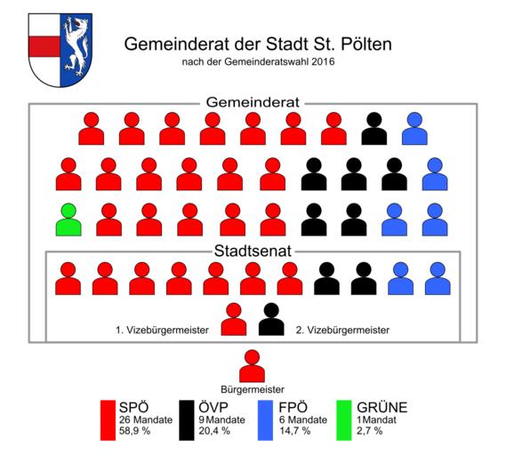 | Keywords: Mandatsverteilung Gemeinderat und Stadtsenat St Poelten 2016.svg de Mandatsverteilung im Gemeinderat und Stadtsenat St Pöltens nach der Gemeinderatswahl 2016 2016-04-17 own AleXXw other versions PD-release St Pölten Gemeinderatswahl 2016 in St Pölten |