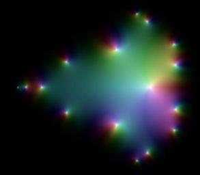| Keywords: Mandelbrot-Iterate-05.jpg The diagram shows the part of the complex plane ranging from “2 2 to 1 on the real axis horizontal and from “1 4i to 1 4i on the imaginary axis vertical The color for a point <math>c</math> in the plane is the color coded value of the function <math>f \ n _c 0 \quad\text for n 5\quad\text and f_c z z 2+c</math> Note that the exponent refers to <math>f</math> as a function and not to its value i e <math>f</math> <math> n</math> denotes n-fold applying <math>f</math> <math>f \ n f\circ f\circ \cdots \circ f</math> So <math>f</math> <math> n</math> is an element of the sequence <math>\begin align f_c \ 0 \ \; z \mapsto z\\ f_c \ 1 \ \; z \mapsto z 2+c\\ f_c \ 2 \ \; z \mapsto z 2+c 2+c\\ f_c \ 3 \ \; z \mapsto z 2+c 2+c 2+c\\ \;\;\vdots \end align </math> For <math>n>0</math> the function <math>f_c n 0 </math> is a polynomial of degree <math>2 n-1 </math> in <math>c</math> Therefore it has <math>2 n-1 </math> zeros in the complex plane It turns out that all zeros are distinct Moreover the zeros are located in a disc around the origin whose diamater does not depend on <math>n</math> Das Diagramm zeigt einen Teil der komplexen Zahlen mit Realteil zwischen “2 2 to 1 horizontal und Imaginärteil zwischen “1 4i und 1 4i vertikal Die Farbe eines Punktes <math>c</math> der Ebene ist der farbcodierte Wert der Funktion <math>f \ n _c 0 \quad\text mit n 5\quad\text und f_c z z 2+c</math> Hierbei bezieht sich der Exponent auf <math>f</math> als Funktion und nicht auf deren Funktionswert d h <math>f</math> <math> n</math> steht fĂĽr die n-fache HintereinanderausfĂĽhrung von <math>f</math> <math>f \ n f\circ f\circ \cdots \circ f</math> Es ist <math>f</math> <math> n</math> also ein Glied der Folge <math>\begin align f_c \ 0 \ \; z \mapsto z\\ f_c \ 1 \ \; z \mapsto z 2+c\\ f_c \ 2 \ \; z \mapsto z 2+c 2+c\\ f_c \ 3 \ \; z \mapsto z 2+c 2+c 2+c\\ \;\;\vdots \end align </math> FĂĽr <math>n>0</math> ist die Funktion <math>f_c n 0 </math> ein Polynom vom Grade <math>2 n-1 </math> in <math>c</math> Somit hat die Funktion <math>2 n-1 </math> Nullstellen die alle verschieden sind Zudem liegen alle Nullstellen in einem Kreis dessen Größe unabhängig von <math>n</math> ist Self made using a throw-away C program 2008-03-24 Georg-Johann Lay Images of the sequence for n 1 20 0 cellpadding 1 cellspacing 1 - 110px thumb left 1 color map 110px thumb left 2 110px thumb left 3 110px thumb left 4 110px thumb left 5 - 110px thumb left 6 110px thumb left 7 110px thumb left 8 110px thumb left 9 110px thumb left 10 - 110px thumb left 11 110px thumb left 12 110px thumb left 13 110px thumb left 14 110px thumb left 15 - 110px thumb left 16 110px thumb left 17 110px thumb left 18 110px thumb left 19 110px thumb left 20 From step to step the number of zeros white is doubling The zeros are chaotically scattered around in a disc whose diameter does not depend on <math>n</math> For values of <math>c</math> that belong the the Mandelbrot set <math>M</math> the sequence <math>f 1_c 0 \; f 2_c 0 \; f 3_c 0 \ \ldots </math> is bounded For values not in <math>M</math> the sequence tends to infinity black Values of <math>c</math> located in the body of <math>M</math> ” the big cardioid ” lead to sequences that converge to a definite complex number In other words these values converge to a cycle of period 1 Values in the head of <math>M</math> ” the big circle at the left of the body ” tend to periodoc cycles of period 2 This can be seen in the sequence of images because the head changes its color from bright to dark and vice versa from step to step Values located in the small bulbs ” the hands symetrically arranged to the body ” tend to periodic cycles of period 3 and so on Von Schritt zu Schritt verdoppelt sich die Anzahl der Nullstellen weiĂź Die Nullstellen sind chaotisch verstreut in einem begrenzten Gebiet dessen Größe nicht von <math>n</math> abhängt FĂĽr Werte <math>c</math> in der Mandelbrot-Mengem <math>M</math> sind die Folgen <math>f 1_c 0 \; f 2_c 0 \; f 3_c 0 \ \ldots </math> beschränkt FĂĽr Werte ausserhalb von <math>M</math> streben die Folgen gegen Unendlich schwarz Werte im Körper von<math>M</math> ” dem Zykloid ” fĂĽhren zu konvergenten Folgen Mit anderen Worten die zugehörigen Folgewerte konvergieren gegen periodische Zykel der Länge 1 Werte im Kopf von <math>M</math> ” dem groĂźen Kreis links am Körper ” streben gegen periodische Zykel der Länge 2 Dies sieht man daran daĂź der Kopf mit jeden Bild seine Farbe von hell nach dunkel wechselt Werte in den Ă„rmchen ” den grösseren Kreisen links und rechts des Körpers ” fĂĽhren zu Folgen deren Grenzzyklen Periode 3 hat usw Coloring complex numbers To color a complex value the function described in <ref>Visualising complex functions</ref> is used with the parameters <math>\begin align a_s 0 6 \ b_s 0 5 \\ a_v 0 4 \ b_v 0 3 \\ \end align </math> and with S and V interchanged Zeros turn to white and infinity to black Zum Färben komplexer Zahlen verwende ich die Methode wie beschrieben in<sup>1</sup> mit den Parametern <math>\begin align a_s 0 6 \ b_s 0 5 \\ a_v 0 4 \ b_v 0 3 \\ \end align </math> und mit vertauschten Rollen von S und V Die Null wird zu WeiĂź und Unendlich zu Schwarz References <references/> Complex color plots of Mandelbrot iterations Order 5 |
