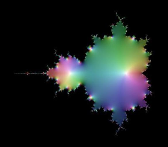 | Keywords: Mandelbrot-Iterate-14.jpg The diagram shows the part of the complex plane ranging from “2 2 to 1 on the real axis horizontal and from “1 4i to 1 4i on the imaginary axis vertical The color for a point <math>c</math> in the plane is the color coded value of the function <math>f \ n _c 0 \quad\text for n 14\quad\text and f_c z z 2+c</math> Note that the exponent refers to <math>f</math> as a function and not to its value i e <math>f</math> <math> n</math> denotes n-fold applying <math>f</math> <math>f \ n f\circ f\circ \cdots \circ f</math> So <math>f</math> <math> n</math> is an element of the sequence <math>\begin align f_c \ 0 z \ \; z \mapsto z\\ f_c \ 1 z \ \; z \mapsto z 2+c\\ f_c \ 2 z \ \; z \mapsto z 2+c 2+c\\ f_c \ 3 z \ \; z \mapsto z 2+c 2+c 2+c\\ \;\;\vdots \end align </math> For <math>n>0</math> the function <math>f_c n 0 </math> is a polynomial of degree <math>2 n-1 </math> in <math>c</math> Therefore it has <math>2 n-1 </math> zeros in the complex plane It turns out that all zeros are distinct Moreover the zeros are located in a disc around the origin whose diamater does not depend on <math>n</math> Das Diagramm zeigt einen Teil der komplexen Zahlen mit Realteil zwischen “2 2 to 1 horizontal und Imaginärteil zwischen “1 4i und 1 4i vertikal Die Farbe eines Punktes <math>c</math> der Ebene ist der farbcodierte Wert der Funktion <math>f \ n _c 0 \quad\text mit n 14\quad\text und f_c z z 2+c</math> Hierbei bezieht sich der Exponent auf <math>f</math> als Funktion und nicht auf deren Funktionswert d h <math>f</math> <math> n</math> steht fĂĽr die n-fache HintereinanderausfĂĽhrung von <math>f</math> <math>f \ n f\circ f\circ \cdots \circ f</math> Es ist <math>f</math> <math> n</math> also ein Glied der Folge <math>\begin align f_c \ 0 z \ \; z \mapsto z\\ f_c \ 1 z \ \; z \mapsto z 2+c\\ f_c \ 2 z \ \; z \mapsto z 2+c 2+c\\ f_c \ 3 z \ \; z \mapsto z 2+c 2+c 2+c\\ \;\;\vdots \end align </math> FĂĽr <math>n>0</math> ist die Funktion <math>f_c n 0 </math> ein Polynom vom Grade <math>2 n-1 </math> in <math>c</math> Somit hat die Funktion <math>2 n-1 </math> Nullstellen die alle verschieden sind Zudem liegen alle Nullstellen in einem Kreis dessen Größe unabhängig von <math>n</math> ist Self made using a throw-away C program 2008-03-24 Georg-Johann Lay Images of the sequence for n 1 20 0 cellpadding 1 cellspacing 1 - 110px thumb left 1 color map 110px thumb left 2 110px thumb left 3 110px thumb left 4 110px thumb left 5 - 110px thumb left 6 110px thumb left 7 110px thumb left 8 110px thumb left 9 110px thumb left 10 - 110px thumb left 11 110px thumb left 12 110px thumb left 13 110px thumb left 14 110px thumb left 15 - 110px thumb left 16 110px thumb left 17 110px thumb left 18 110px thumb left 19 110px thumb left 20 From step to step the number of zeros white is doubling The zeros are chaotically scattered around in a disc whose diameter does not depend on <math>n</math> For values of <math>c</math> that belong the the Mandelbrot set <math>M</math> the sequence <math>f 1_c 0 \; f 2_c 0 \; f 3_c 0 \ \ldots </math> is bounded For values not in <math>M</math> the sequence tends to infinity black Values of <math>c</math> located in the body of <math>M</math> ” the big cardioid ” lead to sequences that converge to a definite complex number In other words these values converge to a cycle of period 1 Values in the head of <math>M</math> ” the big circle at the left of the body ” tend to periodoc cycles of period 2 This can be seen in the sequence of images because the head changes its color from bright to dark and vice versa from step to step Values located in the small bulbs ” the hands symetrically arranged to the body ” tend to periodic cycles of period 3 and so on Von Schritt zu Schritt verdoppelt sich die Anzahl der Nullstellen weiĂź Die Nullstellen sind chaotisch verstreut in einem begrenzten Gebiet dessen Größe nicht von <math>n</math> abhängt FĂĽr Werte <math>c</math> in der Mandelbrot-Mengem <math>M</math> sind die Folgen <math>f 1_c 0 \; f 2_c 0 \; f 3_c 0 \ \ldots </math> beschränkt FĂĽr Werte ausserhalb von <math>M</math> streben die Folgen gegen Unendlich schwarz Werte im Körper von<math>M</math> ” dem Zykloid ” fĂĽhren zu konvergenten Folgen Mit anderen Worten die zugehörigen Folgewerte konvergieren gegen periodische Zykel der Länge 1 Werte im Kopf von <math>M</math> ” dem groĂźen Kreis links am Körper ” streben gegen periodische Zykel der Länge 2 Dies sieht man daran daĂź der Kopf mit jeden Bild seine Farbe von hell nach dunkel wechselt Werte in den Ă„rmchen ” den grösseren Kreisen links und rechts des Körpers ” fĂĽhren zu Folgen deren Grenzzyklen Periode 3 hat usw Coloring complex numbers To color a complex value the function described in <ref>Visualising complex functions</ref> is used with the parameters <math>\begin align a_s 0 6 \ b_s 0 5 \\ a_v 0 4 \ b_v 0 3 \\ \end align </math> and with S and V interchanged Zeros turn to white and infinity to black Zum Färben komplexer Zahlen verwende ich die Methode wie beschrieben in<sup>1</sup> mit den Parametern <math>\begin align a_s 0 6 \ b_s 0 5 \\ a_v 0 4 \ b_v 0 3 \\ \end align </math> und mit vertauschten Rollen von S und V Die Null wird zu WeiĂź und Unendlich zu Schwarz References <references/> Complex color plots of Mandelbrot iterations Order 14 |