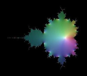 | Keywords: Mandelbrot-Iterate-17.jpg The diagram shows the part of the complex plane ranging from “2 2 to 1 on the real axis horizontal and from “1 4i to 1 4i on the imaginary axis vertical The color for a point <math>c</math> in the plane is the color coded value of the function <math>f \ n _c 0 \quad\text for n 17\quad\text and f_c z z 2+c</math> Note that the exponent refers to <math>f</math> as a function and not to its value i e <math>f</math> <math> n</math> denotes n-fold applying <math>f</math> <math>f \ n f\circ f\circ \cdots \circ f</math> So <math>f</math> <math> n</math> is an element of the sequence <math>\begin align f_c \ 0 z \ \; z \mapsto z\\ f_c \ 1 z \ \; z \mapsto z 2+c\\ f_c \ 2 z \ \; z \mapsto z 2+c 2+c\\ f_c \ 3 z \ \; z \mapsto z 2+c 2+c 2+c\\ \;\;\vdots \end align </math> For <math>n>0</math> the function <math>f_c n 0 </math> is a polynomial of degree <math>2 n-1 </math> in <math>c</math> Therefore it has <math>2 n-1 </math> zeros in the complex plane It turns out that all zeros are distinct Moreover the zeros are located in a disc around the origin whose diamater does not depend on <math>n</math> Das Diagramm zeigt einen Teil der komplexen Zahlen mit Realteil zwischen “2 2 to 1 horizontal und Imaginärteil zwischen “1 4i und 1 4i vertikal Die Farbe eines Punktes <math>c</math> der Ebene ist der farbcodierte Wert der Funktion <math>f \ n _c 0 \quad\text mit n 17\quad\text und f_c z z 2+c</math> Hierbei bezieht sich der Exponent auf <math>f</math> als Funktion und nicht auf deren Funktionswert d h <math>f</math> <math> n</math> steht fĂĽr die n-fache HintereinanderausfĂĽhrung von <math>f</math> <math>f \ n f\circ f\circ \cdots \circ f</math> Es ist <math>f</math> <math> n</math> also ein Glied der Folge <math>\begin align f_c \ 0 z \ \; z \mapsto z\\ f_c \ 1 z \ \; z \mapsto z 2+c\\ f_c \ 2 z \ \; z \mapsto z 2+c 2+c\\ f_c \ 3 z \ \; z \mapsto z 2+c 2+c 2+c\\ \;\;\vdots \end align </math> FĂĽr <math>n>0</math> ist die Funktion <math>f_c n 0 </math> ein Polynom vom Grade <math>2 n-1 </math> in <math>c</math> Somit hat die Funktion <math>2 n-1 </math> Nullstellen die alle verschieden sind Zudem liegen alle Nullstellen in einem Kreis dessen Größe unabhängig von <math>n</math> ist Self made using a throw-away C program 2008-03-24 Georg-Johann Lay Images of the sequence for n 1 20 0 cellpadding 1 cellspacing 1 - 110px thumb left 1 color map 110px thumb left 2 110px thumb left 3 110px thumb left 4 110px thumb left 5 - 110px thumb left 6 110px thumb left 7 110px thumb left 8 110px thumb left 9 110px thumb left 10 - 110px thumb left 11 110px thumb left 12 110px thumb left 13 110px thumb left 14 110px thumb left 15 - 110px thumb left 16 110px thumb left 17 110px thumb left 18 110px thumb left 19 110px thumb left 20 From step to step the number of zeros white is doubling The zeros are chaotically scattered around in a disc whose diameter does not depend on <math>n</math> For values of <math>c</math> that belong the the Mandelbrot set <math>M</math> the sequence <math>f 1_c 0 \; f 2_c 0 \; f 3_c 0 \ \ldots </math> is bounded For values not in <math>M</math> the sequence tends to infinity black Values of <math>c</math> located in the body of <math>M</math> ” the big cardioid ” lead to sequences that converge to a definite complex number In other words these values converge to a cycle of period 1 Values in the head of <math>M</math> ” the big circle at the left of the body ” tend to periodoc cycles of period 2 This can be seen in the sequence of images because the head changes its color from bright to dark and vice versa from step to step Values located in the small bulbs ” the hands symetrically arranged to the body ” tend to periodic cycles of period 3 and so on Von Schritt zu Schritt verdoppelt sich die Anzahl der Nullstellen weiĂź Die Nullstellen sind chaotisch verstreut in einem begrenzten Gebiet dessen Größe nicht von <math>n</math> abhängt FĂĽr Werte <math>c</math> in der Mandelbrot-Mengem <math>M</math> sind die Folgen <math>f 1_c 0 \; f 2_c 0 \; f 3_c 0 \ \ldots </math> beschränkt FĂĽr Werte ausserhalb von <math>M</math> streben die Folgen gegen Unendlich schwarz Werte im Körper von<math>M</math> ” dem Zykloid ” fĂĽhren zu konvergenten Folgen Mit anderen Worten die zugehörigen Folgewerte konvergieren gegen periodische Zykel der Länge 1 Werte im Kopf von <math>M</math> ” dem groĂźen Kreis links am Körper ” streben gegen periodische Zykel der Länge 2 Dies sieht man daran daĂź der Kopf mit jeden Bild seine Farbe von hell nach dunkel wechselt Werte in den Ă„rmchen ” den grösseren Kreisen links und rechts des Körpers ” fĂĽhren zu Folgen deren Grenzzyklen Periode 3 hat usw Coloring complex numbers To color a complex value the function described in <ref>Visualising complex functions</ref> is used with the parameters <math>\begin align a_s 0 6 \ b_s 0 5 \\ a_v 0 4 \ b_v 0 3 \\ \end align </math> and with S and V interchanged Zeros turn to white and infinity to black Zum Färben komplexer Zahlen verwende ich die Methode wie beschrieben in<sup>1</sup> mit den Parametern <math>\begin align a_s 0 6 \ b_s 0 5 \\ a_v 0 4 \ b_v 0 3 \\ \end align </math> und mit vertauschten Rollen von S und V Die Null wird zu WeiĂź und Unendlich zu Schwarz References <references/> Complex color plots of Mandelbrot iterations Order 17 |