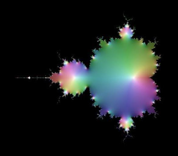 | Keywords: Mandelbrot-Iterate-18.jpg The diagram shows the part of the complex plane ranging from “2 2 to 1 on the real axis horizontal and from “1 4i to 1 4i on the imaginary axis vertical The color for a point <math>c</math> in the plane is the color coded value of the function <math>f \ n _c 0 \quad\text for n 18\quad\text and f_c z z 2+c</math> Note that the exponent refers to <math>f</math> as a function and not to its value i e <math>f</math> <math> n</math> denotes n-fold applying <math>f</math> <math>f \ n f\circ f\circ \cdots \circ f</math> So <math>f</math> <math> n</math> is an element of the sequence <math>\begin align f_c \ 0 \ \; z \mapsto z\\ f_c \ 1 \ \; z \mapsto z 2+c\\ f_c \ 2 \ \; z \mapsto z 2+c 2+c\\ f_c \ 3 \ \; z \mapsto z 2+c 2+c 2+c\\ \;\;\vdots \end align </math> For <math>n>0</math> the function <math>f_c n 0 </math> is a polynomial of degree <math>2 n-1 </math> in <math>c</math> Therefore it has <math>2 n-1 </math> zeros in the complex plane It turns out that all zeros are distinct Moreover the zeros are located in a disc around the origin whose diamater does not depend on <math>n</math> Das Diagramm zeigt einen Teil der komplexen Zahlen mit Realteil zwischen “2 2 to 1 horizontal und Imaginärteil zwischen “1 4i und 1 4i vertikal Die Farbe eines Punktes <math>c</math> der Ebene ist der farbcodierte Wert der Funktion <math>f \ n _c 0 \quad\text mit n 18\quad\text und f_c z z 2+c</math> Hierbei bezieht sich der Exponent auf <math>f</math> als Funktion und nicht auf deren Funktionswert d h <math>f</math> <math> n</math> steht fĂĽr die n-fache HintereinanderausfĂĽhrung von <math>f</math> <math>f \ n f\circ f\circ \cdots \circ f</math> Es ist <math>f</math> <math> n</math> also ein Glied der Folge <math>\begin align f_c \ 0 \ \; z \mapsto z\\ f_c \ 1 \ \; z \mapsto z 2+c\\ f_c \ 2 \ \; z \mapsto z 2+c 2+c\\ f_c \ 3 \ \; z \mapsto z 2+c 2+c 2+c\\ \;\;\vdots \end align </math> FĂĽr <math>n>0</math> ist die Funktion <math>f_c n 0 </math> ein Polynom vom Grade <math>2 n-1 </math> in <math>c</math> Somit hat die Funktion <math>2 n-1 </math> Nullstellen die alle verschieden sind Zudem liegen alle Nullstellen in einem Kreis dessen Größe unabhängig von <math>n</math> ist Self made using a throw-away C program 2008-03-24 Georg-Johann Lay Images of the sequence for n 1 20 0 cellpadding 1 cellspacing 1 - 110px thumb left 1 color map 110px thumb left 2 110px thumb left 3 110px thumb left 4 110px thumb left 5 - 110px thumb left 6 110px thumb left 7 110px thumb left 8 110px thumb left 9 110px thumb left 10 - 110px thumb left 11 110px thumb left 12 110px thumb left 13 110px thumb left 14 110px thumb left 15 - 110px thumb left 16 110px thumb left 17 110px thumb left 18 110px thumb left 19 110px thumb left 20 From step to step the number of zeros white is doubling The zeros are chaotically scattered around in a disc whose diameter does not depend on <math>n</math> For values of <math>c</math> that belong the the Mandelbrot set <math>M</math> the sequence <math>f 1_c 0 \; f 2_c 0 \; f 3_c 0 \ \ldots </math> is bounded For values not in <math>M</math> the sequence tends to infinity black Values of <math>c</math> located in the body of <math>M</math> ” the big cardioid ” lead to sequences that converge to a definite complex number In other words these values converge to a cycle of period 1 Values in the head of <math>M</math> ” the big circle at the left of the body ” tend to periodoc cycles of period 2 This can be seen in the sequence of images because the head changes its color from bright to dark and vice versa from step to step Values located in the small bulbs ” the hands symetrically arranged to the body ” tend to periodic cycles of period 3 and so on Von Schritt zu Schritt verdoppelt sich die Anzahl der Nullstellen weiĂź Die Nullstellen sind chaotisch verstreut in einem begrenzten Gebiet dessen Größe nicht von <math>n</math> abhängt FĂĽr Werte <math>c</math> in der Mandelbrot-Mengem <math>M</math> sind die Folgen <math>f 1_c 0 \; f 2_c 0 \; f 3_c 0 \ \ldots </math> beschränkt FĂĽr Werte ausserhalb von <math>M</math> streben die Folgen gegen Unendlich schwarz Werte im Körper von<math>M</math> ” dem Zykloid ” fĂĽhren zu konvergenten Folgen Mit anderen Worten die zugehörigen Folgewerte konvergieren gegen periodische Zykel der Länge 1 Werte im Kopf von <math>M</math> ” dem groĂźen Kreis links am Körper ” streben gegen periodische Zykel der Länge 2 Dies sieht man daran daĂź der Kopf mit jeden Bild seine Farbe von hell nach dunkel wechselt Werte in den Ă„rmchen ” den grösseren Kreisen links und rechts des Körpers ” fĂĽhren zu Folgen deren Grenzzyklen Periode 3 hat usw Coloring complex numbers To color a complex value the function described in <ref>Visualising complex functions</ref> is used with the parameters <math>\begin align a_s 0 6 \ b_s 0 5 \\ a_v 0 4 \ b_v 0 3 \\ \end align </math> and with S and V interchanged Zeros turn to white and infinity to black Zum Färben komplexer Zahlen verwende ich die Methode wie beschrieben in<sup>1</sup> mit den Parametern <math>\begin align a_s 0 6 \ b_s 0 5 \\ a_v 0 4 \ b_v 0 3 \\ \end align </math> und mit vertauschten Rollen von S und V Die Null wird zu WeiĂź und Unendlich zu Schwarz References <references/> Complex color plots of Mandelbrot iterations Order 18 |