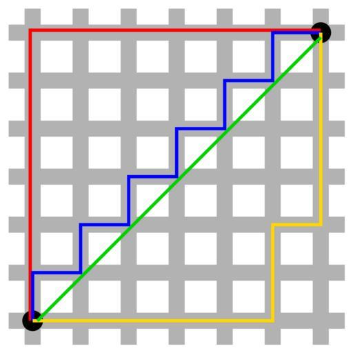 | Keywords: Manhattan distance.svg Figure illustrating Manhattan versus Euclidean distance The red blue and yellow lines all have the same length 12 whereas the green line has length <math>\sqrt 72 \approx 8 4853</math> Created by User Psychonaut with XFig 2006-04-25 User Psychonaut I release this image and its source code into the public domain Source code <pre> FIG 3 2 Landscape Center Metric A4 100 00 Single -2 1200 2 0 32 b2b2b2 1 3 0 1 0 0 40 -1 20 0 000 1 0 0000 3150 450 127 127 3150 450 3240 540 1 3 0 1 0 0 40 -1 20 0 000 1 0 0000 450 3150 127 127 450 3150 540 3240 2 1 0 10 32 32 50 -1 0 0 000 0 0 -1 0 0 2 450 3375 450 225 2 1 0 10 32 32 50 -1 0 0 000 0 0 -1 0 0 2 900 3375 900 225 2 1 0 10 32 32 50 -1 0 0 000 0 0 -1 0 0 2 1350 3375 1350 225 2 1 0 10 32 32 50 -1 0 0 000 0 0 -1 0 0 2 1800 3375 1800 225 2 1 0 10 32 32 50 -1 0 0 000 0 0 -1 0 0 2 2700 3375 2700 225 2 1 0 10 32 32 50 -1 0 0 000 0 0 -1 0 0 2 3150 3375 3150 225 2 1 0 10 32 32 50 -1 0 0 000 0 0 -1 0 0 2 2250 3375 2250 225 2 1 0 10 32 32 50 -1 0 0 000 0 0 -1 0 0 2 225 450 3375 450 2 1 0 10 32 32 50 -1 0 0 000 0 0 -1 0 0 2 225 900 3375 900 2 1 0 10 32 32 50 -1 0 0 000 0 0 -1 0 0 2 225 1350 3375 1350 2 1 0 10 32 32 50 -1 0 0 000 0 0 -1 0 0 2 225 1800 3375 1800 2 1 0 10 32 32 50 -1 0 0 000 0 0 -1 0 0 2 225 2250 3375 2250 2 1 0 10 32 32 50 -1 0 0 000 0 0 -1 0 0 2 225 2700 3375 2700 2 1 0 10 32 32 50 -1 0 0 000 0 0 -1 0 0 2 225 3150 3375 3150 2 1 0 2 4 4 30 -1 -1 0 000 0 0 -1 0 0 3 427 3150 427 427 3150 427 2 1 0 2 1 4 30 -1 -1 0 000 0 0 -1 0 0 13 450 3150 450 2700 900 2700 900 2250 1350 2250 1350 1800 1800 1800 1800 1350 2250 1350 2250 900 2700 900 2700 450 3150 450 2 1 0 2 31 4 30 -1 -1 0 000 0 0 -1 0 0 5 450 3150 2700 3150 2700 2250 3150 2250 3150 450 2 1 0 2 14 4 30 -1 -1 0 000 0 0 -1 0 0 2 495 3150 3150 495 </pre> taxicab distance |