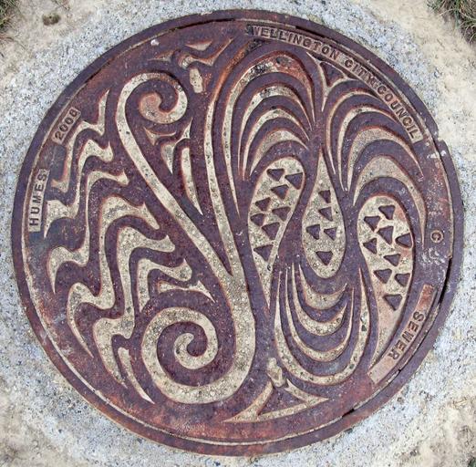Keywords: Manhole cover WLG.jpg A manhole cover in W Wellington City Council Wellington with Māori culture Māori -like ornaments 2013-02-03 own Sarang Manhole covers in New Zealand Wellington