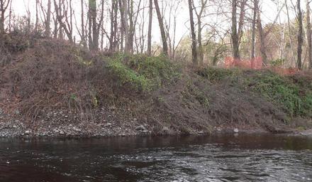 Keywords: Manna site cut bank series e.jpg en Raymondskill Creek just above its junction with the Delaware River in Delaware Water Gap National Recreation Area in Pike County Pennsylvania Fifth upstream-most in a series of five photos of the south bank moving upstream showing erosion into the Manna archaeological site; the site is part of the Minisink Historic District which is listed in the National Register of Historic Places 2011-11-26 own Ammodramus cc-zero Uploaded with UploadWizard Pictures by Ammodramus Taken with Panasonic Lumix DMC-FZ20 Manna archaeological site |