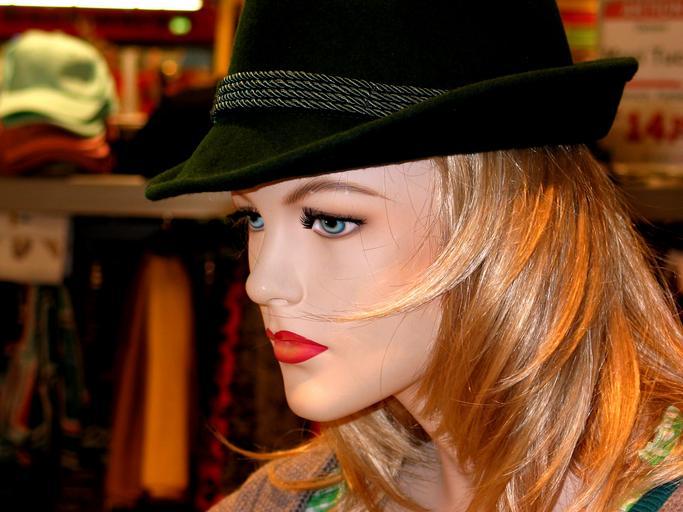 Keywords: mannequin figure deco advertising fig doll hat profile face hair eyes nose mouth clothing head pretty girl nice red lips fashion skin color beautiful human sweet woman red lips hairstyle make up model portrait