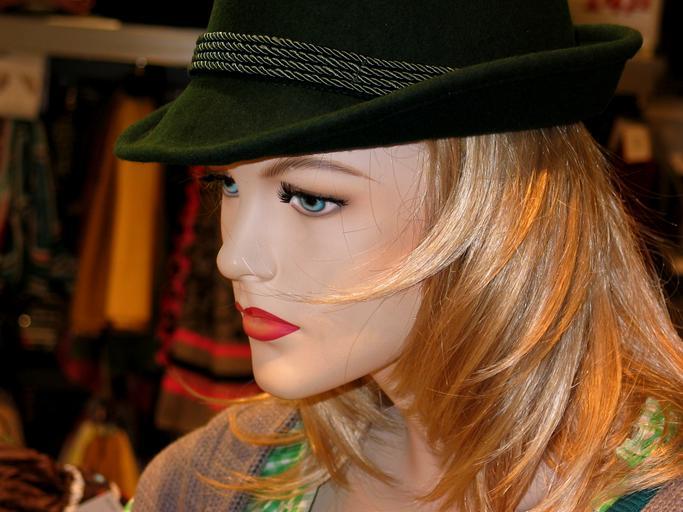 Keywords: mannequin figure deco advertising fig doll hat profile face hair eyes nose mouth clothing head pretty girl nice red lips fashion skin color beautiful human sweet woman red lips hairstyle make up model portrait