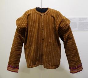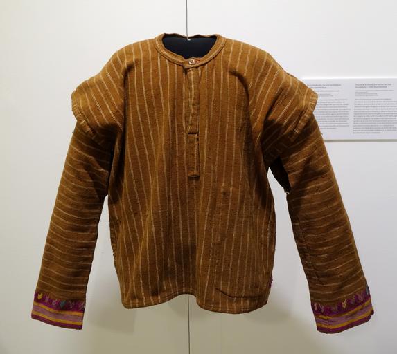 Keywords: Man's cofradia shirt, Kaqchikel Maya, San Juan Sacatepequez, c. 1930s, cotton and silk, shellfish purple dye - Textile Museum of Canada - DSC01111.JPG en Exhibit in the Textile Museum of Canada 55 Centre Avenue Toronto Ontario Canada Photography was permitted in the museum without restriction 2013-07-04 14 42 19 own Daderot cc-zero Maya textiles in the Textile Museum of Canada Uploaded with UploadWizard