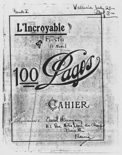 | Keywords: Manuscript Notebook of "The Sun Also Rises" - NARA - 192680.jpg Scope and content General notes 192680 Local identifier Hemingway Ernest 1899-1961 John F Kennedy Library NLJFK Columbia Point Boston MA 02125-3398 date 1925 07 23 - 1925 08 03 Record group Collection JFK-EHEMC Ernest Hemingway Collection 01/01/1880 - 12/31/1999 Record group ARC 1156 Manuscripts compiled 09/01/1916 - 12/31/1999 Series ARC 192676 File unit 194 The Sun Also Rises Notebooks 07/23/1925 - 08/03/1925 File unit ARC 192679 Variant control numbers NAIL Control Number NLK-EHEMC-MANUSCRIPTS-SUNALSORISES-8BB Other versions <gallery> File Manuscript_Notebook_of_ The_Sun_Also_Rises _-_NARA_-_192680 tif tif File Manuscript_Notebook_of_ The_Sun_Also_Rises _-_NARA_-_192680 jpg jpg </gallery> NARA-cooperation PD-USGov John F Kennedy Library Ernest Hemingway Notebooks |