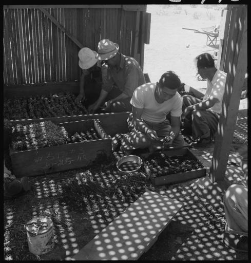 | Keywords: Manzanar Relocation Center, Manzanar, California. A view of section of the lath house at this War . . . - NARA - 538034.jpg Scope and content The full caption for this photograph reads Manzanar Relocation Center Manzanar California A view of section of the lath house at this War Relocation Authority center where seedling guayule plants are propagated by experienced nurserymen evacuees in the guayule rubber experiment work General notes 538034 Local identifier 210-G-C740 Department of the Interior War Relocation Authority 02/16/1944 - 06/30/1946 NARA-Author Lange Dorothea 1895-1965 Photographer 1372774 <br /> Still Picture Records Section Special Media Archives Services Division NWCS-S National Archives at College Park 8601 Adelphi Road College Park MD 20740-6001 1942-06-28 Record group Record Group 210 Records of the War Relocation Authority 1941 - 1989 Record group ARC 537 Central Photographic File of the War Relocation Authority compiled 1942 - 1945 Series ARC 536000 File unit File unit ARC Variant control numbers NAIL Control Number NWDNS-210-G-C740 Other versions <gallery> File Manzanar_Relocation_Center _Manzanar _California _A_view_of_section_of_the_lath_house_at_this_War_ _ _ _-_NARA_-_538034 tif tif File Manzanar_Relocation_Center _Manzanar _California _A_view_of_section_of_the_lath_house_at_this_War_ _ _ _-_NARA_-_538034 jpg jpg </gallery> NARA-cooperation PD-USGov Photographs by Dorothea Lange of Manzanar War Relocation Center |