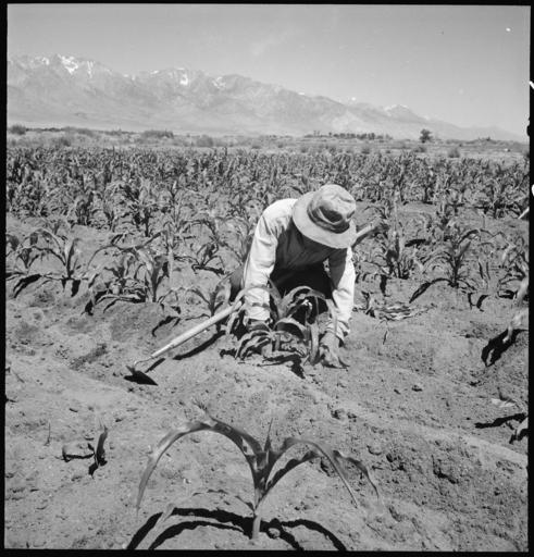 Keywords: Manzanar Relocation Center, Manzanar, California. Hoeing corn on the farm project at his War Reloca . . . - NARA - 538054.jpg Scope and content The full caption for this photograph reads Manzanar Relocation Center Manzanar California Hoeing corn on the farm project at his War Relocation Authority center for evacuees of Japanese ancestry 125 acres have already been cleared and put into crops General notes 538054 Local identifier 210-G-C760 Department of the Interior War Relocation Authority 02/16/1944 - 06/30/1946 NARA-Author Lange Dorothea 1895-1965 Photographer 1372774 <br /> Still Picture Records Section Special Media Archives Services Division NWCS-S National Archives at College Park 8601 Adelphi Road College Park MD 20740-6001 1942-06-30 Record group Record Group 210 Records of the War Relocation Authority 1941 - 1989 Record group ARC 537 Central Photographic File of the War Relocation Authority compiled 1942 - 1945 Series ARC 536000 File unit File unit ARC Variant control numbers NAIL Control Number NWDNS-210-G-C760 Other versions <gallery> File Manzanar_Relocation_Center _Manzanar _California _Hoeing_corn_on_the_farm_project_at_his_War_Reloca_ _ _ _-_NARA_-_538054 tif tif File Manzanar_Relocation_Center _Manzanar _California _Hoeing_corn_on_the_farm_project_at_his_War_Reloca_ _ _ _-_NARA_-_538054 jpg jpg </gallery> NARA-cooperation PD-USGov Photographs by Dorothea Lange of Manzanar War Relocation Center |
