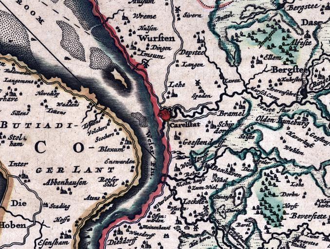 | Keywords: Map of the estuary of the Weser River (clipping) - 1685.jpg en Clipping from an old map of the Herzogtümer Bremen und Verden Duchies of Bremen and Verden Germany made around 1685 by Nicolaes Visscher showing the region of the estuary of the Weser River de Ausschnitt aus einer alten Karte der Herzogtümer Bremen und Verden um 1685 von Nicolaes Visscher erstellt der die Region der Wesermündung zeigt Map Ducatus Bremae et Ferdae Maximaeque partis Ducatus Stormariae Comitatus Oldenburgi Albis Visurgisque Fluminum Novissima Descriptio Nicolaes Visscher 1685 PD-old-100 Carlsburg Lehe Old maps of Lower Saxony Maps of Weser Weser in Bremerhaven Lehe Bremerhaven |