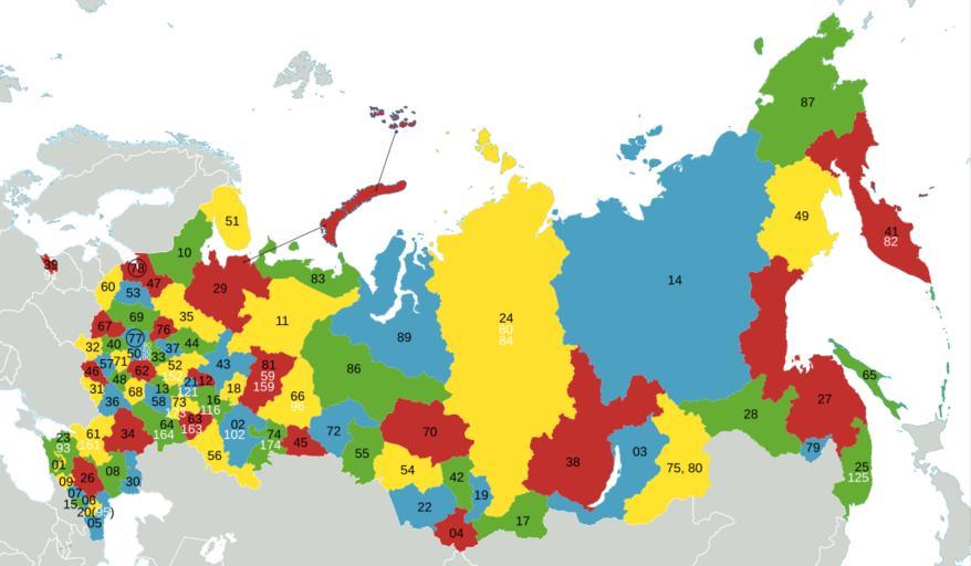 | Keywords: Map Federal subjects of Russia (by number).svg GIBDD-GAI Коды субъектов Российской Феде ации Белым выделены коды используемые ГИБДД-ГАИ Public domain map by EIA File Former USSR Oil and Gas map svg Information on codes taken from the Russian Wikipedia's article by see authors at the http //ru wikipedia org/w/index php title Коды_субъектов_Российской_Феде ации action history history page Ahnode 2009-05-09 ru map Subdivisions of Russia | ||||