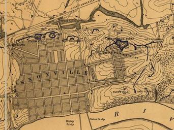 | Keywords: Map image2.jpg en Detail of Approaches and Defences of Knoxville showing Union fortifications in what is now downtown Knoxville and East Knoxville Tennessee USA in late-1863 and 1864 LOC-map g3964k cw0427000 Cleveland Rockwell map Orlando Poe survey The Graphic Company lithograph 1864 PD-USGov Approaches and defenses of Knoxville Tennessee 1864 |