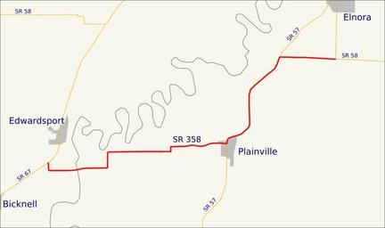 Keywords: Map of Indiana State Road 358.svg This is a map which shows the route of Indiana State Road 358 in the United States My own work using freely-available shape data and custom-written MapScript applications 2008-03-04 Omnedon Road maps of Indiana SR358 |