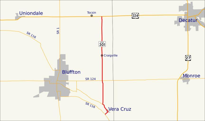 Keywords: Map of Indiana State Road 301.svg This is a map which shows the route of Indiana State Road 301 in the United States My own work using freely-available shape data and custom-written MapScript applications 2008-03-16 Omnedon Road maps of Indiana SR301 |